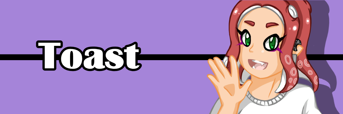 Toast: An Octoling with a carefree and free-spirited nature, she does whatever she wants whenever she wants. Her spontaneous nature leaves her pretty open and down to do most things, but when it comes to sticking to it, that's a bit more complicated. She is age 24 at the start of the series.